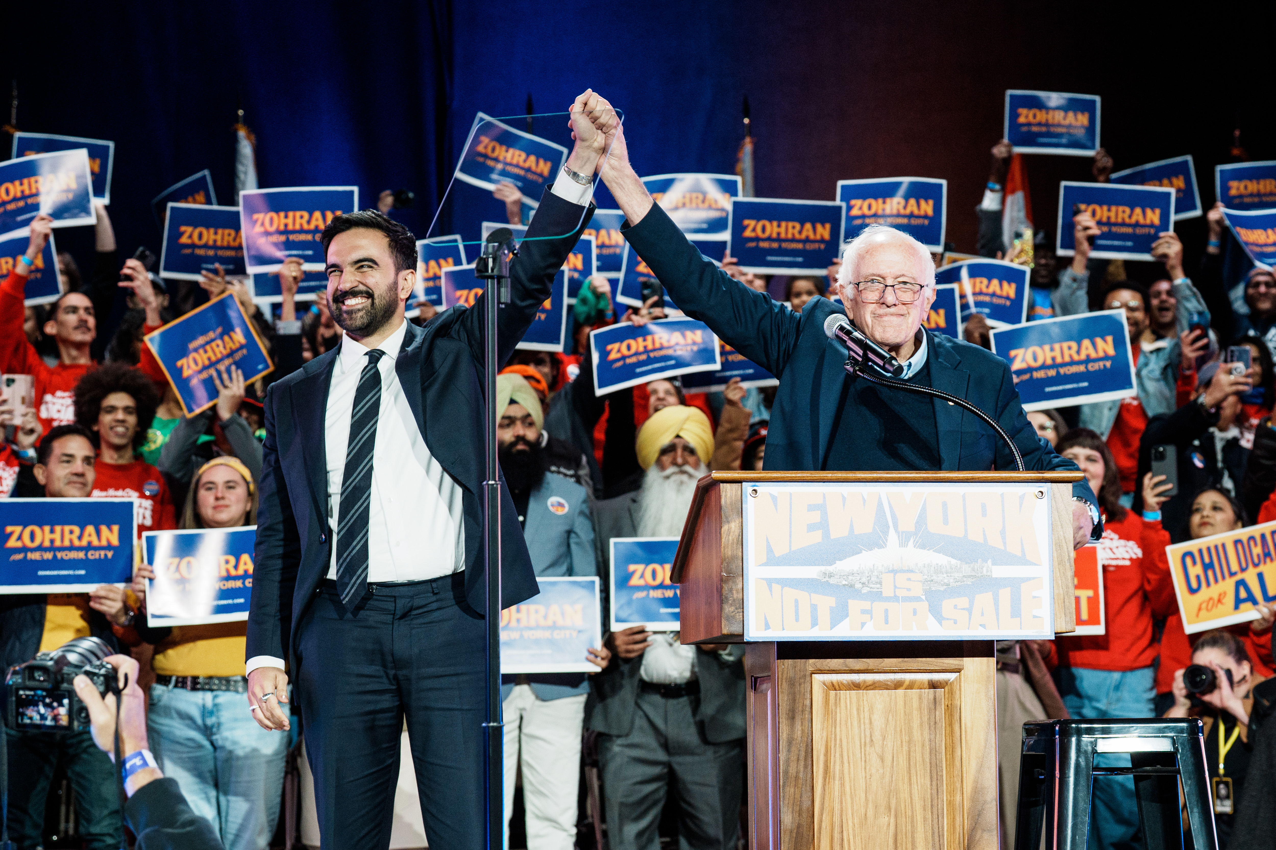 Flanked by Sen. Bernie Sanders and Rep. Alexandria Ocasio-Cortez, Mamdani denounced what he described as the influence of “billionaires and oligarchs” over city politics. He pledged to freeze rent increases on roughly 1 million regulated apartments, hire thousands of new teachers, and expand affordable housing and universal childcare programs.